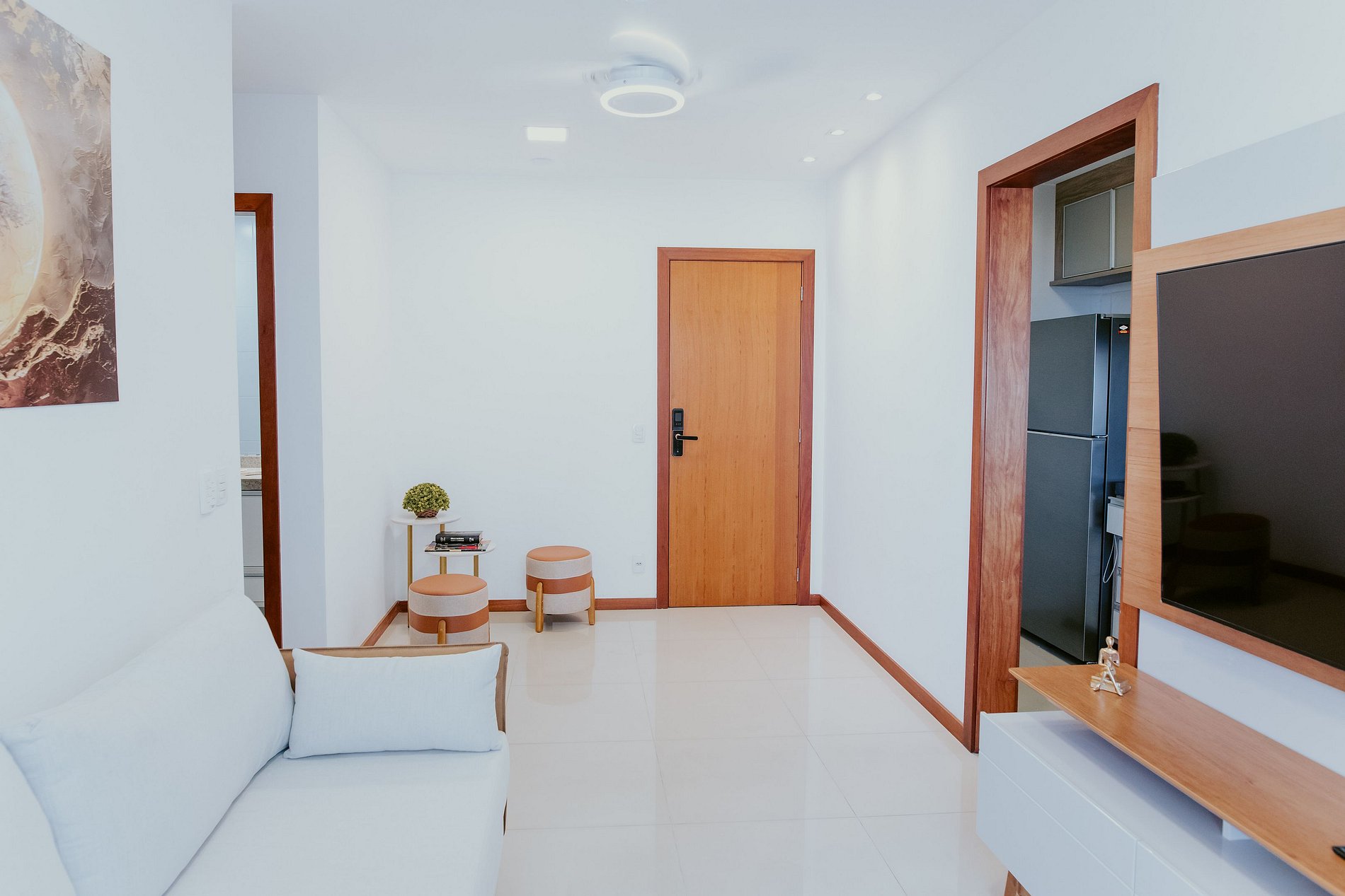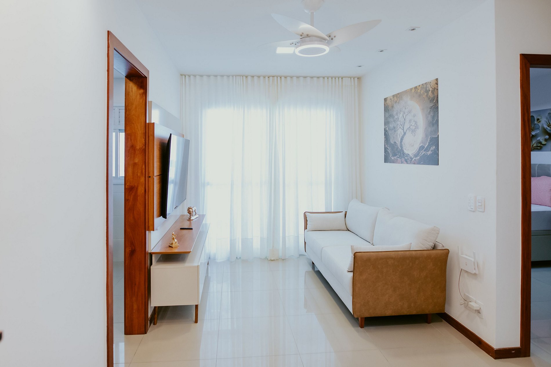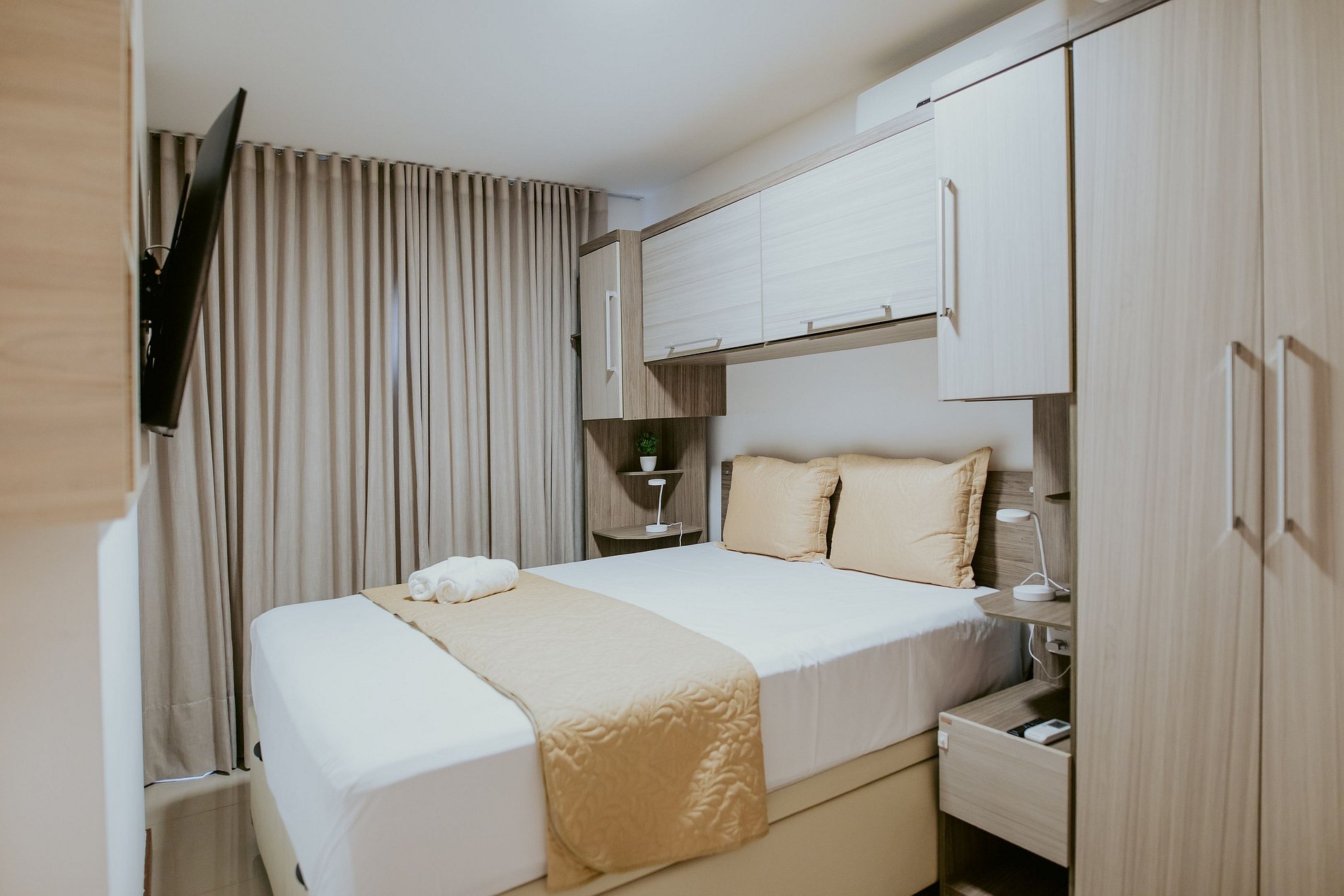 O espaço possui dois quartos bem iluminados e equipados: a suíte principal conta com uma cama queen-size e ar-condicionado, o segundo quarto dispõe de uma queen-size, ambos com roupas de cama de alta qualidade e armários espaçosos para maior praticidade. A sala de estar é convidativa, equipada com sofá confortável e televisão com streaming.