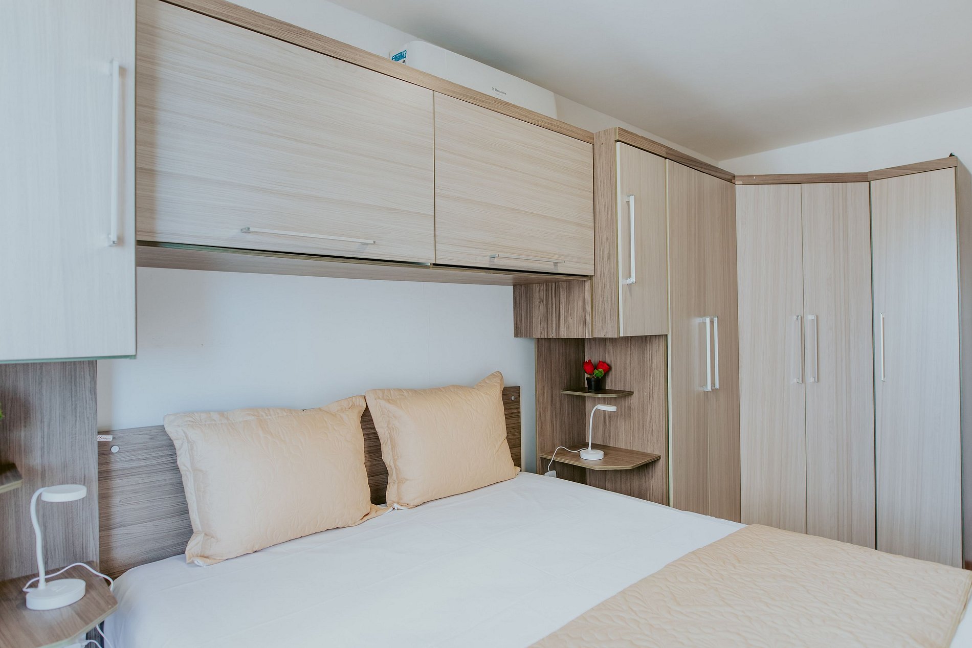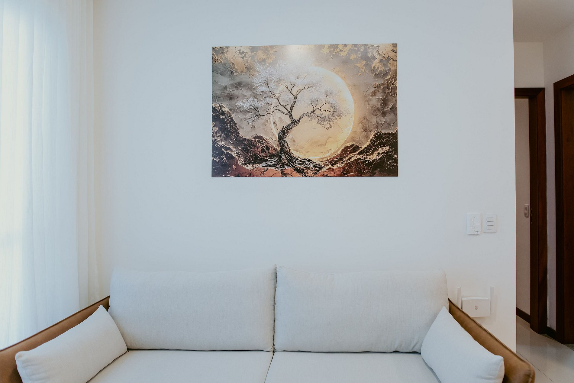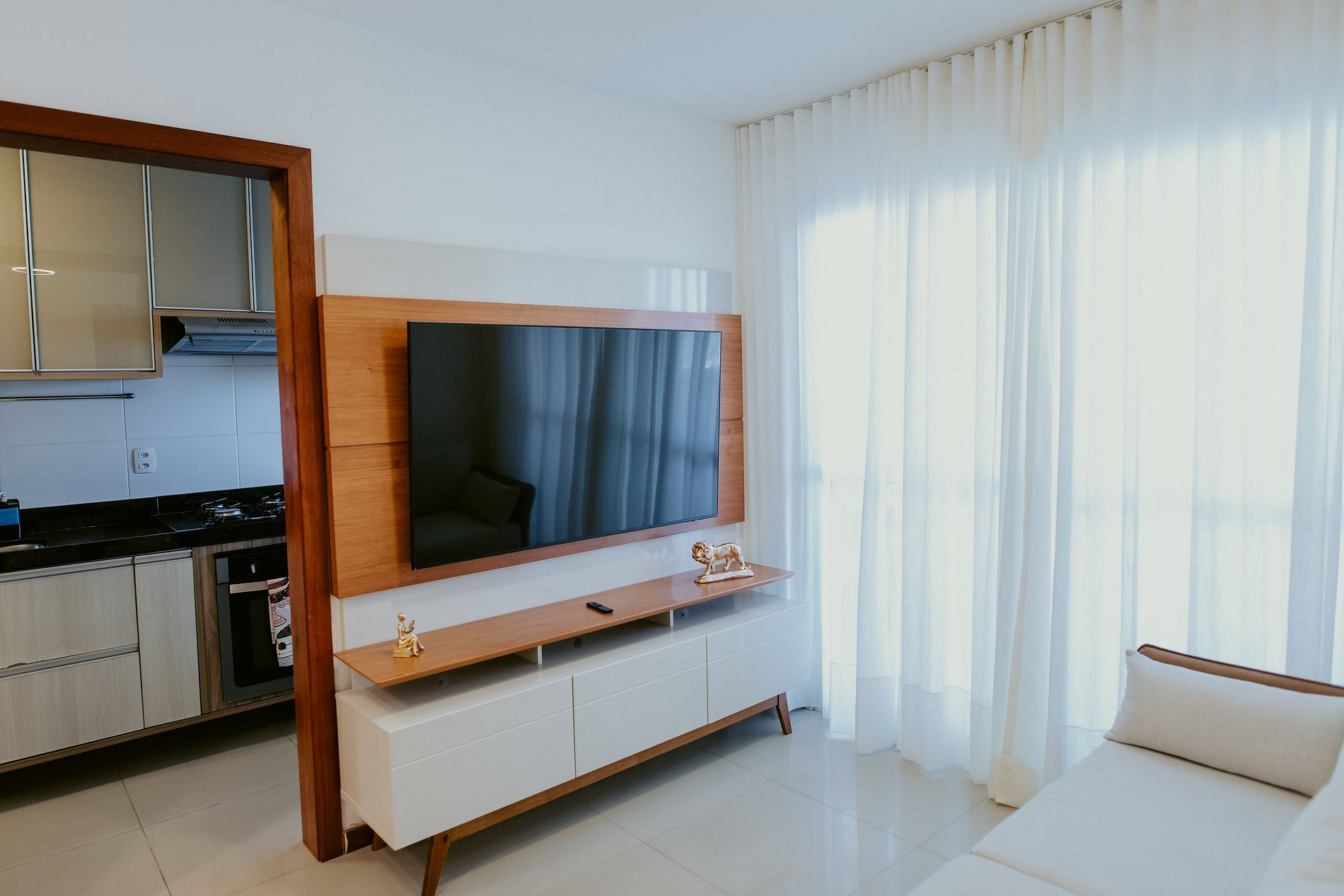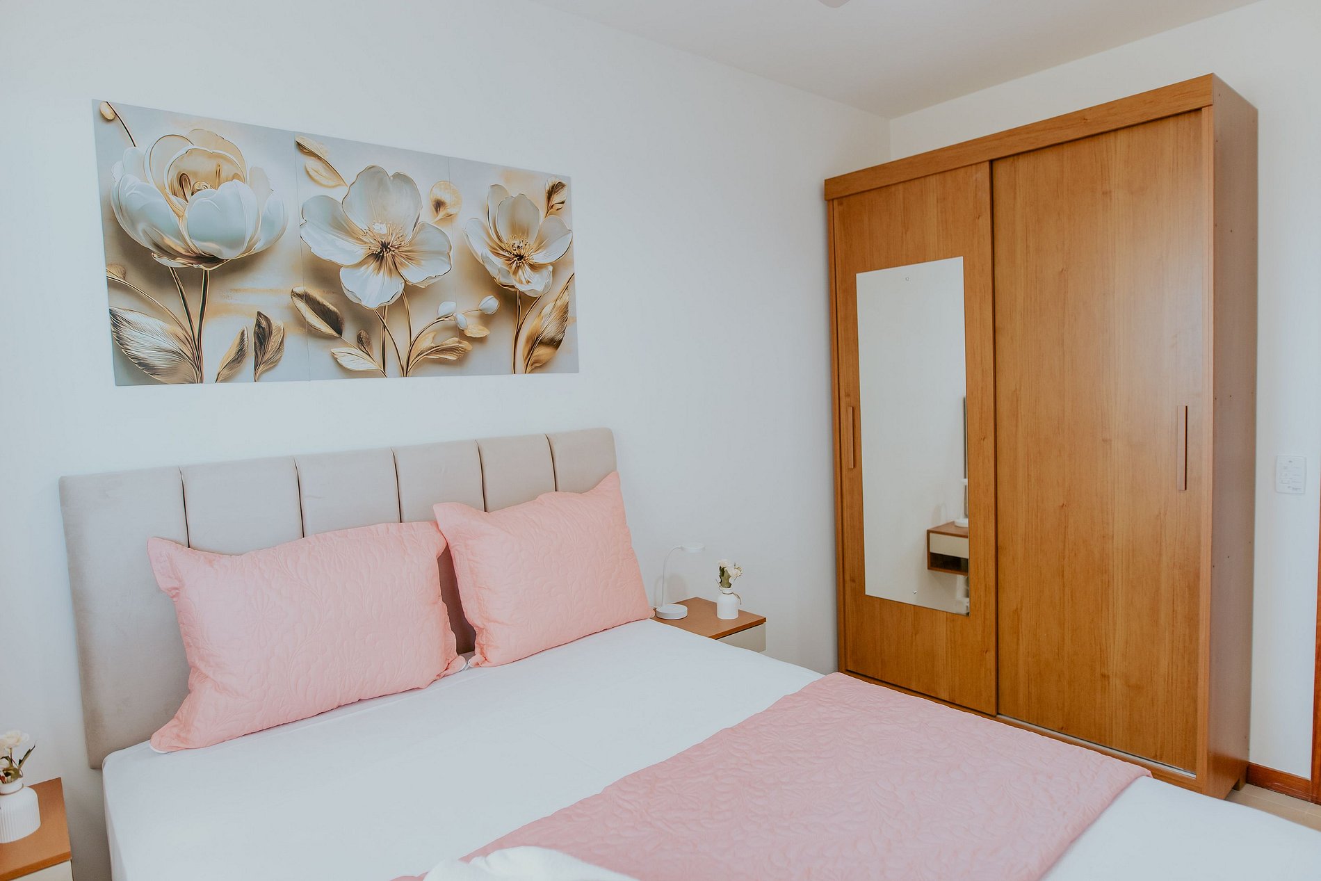 O espaço possui dois quartos bem iluminados e equipados: a suíte principal conta com uma cama queen-size e ar-condicionado, o segundo quarto dispõe de uma queen-size, ambos com roupas de cama de alta qualidade e armários espaçosos para maior praticidade. A sala de estar é convidativa, equipada com sofá confortável e televisão com streaming.