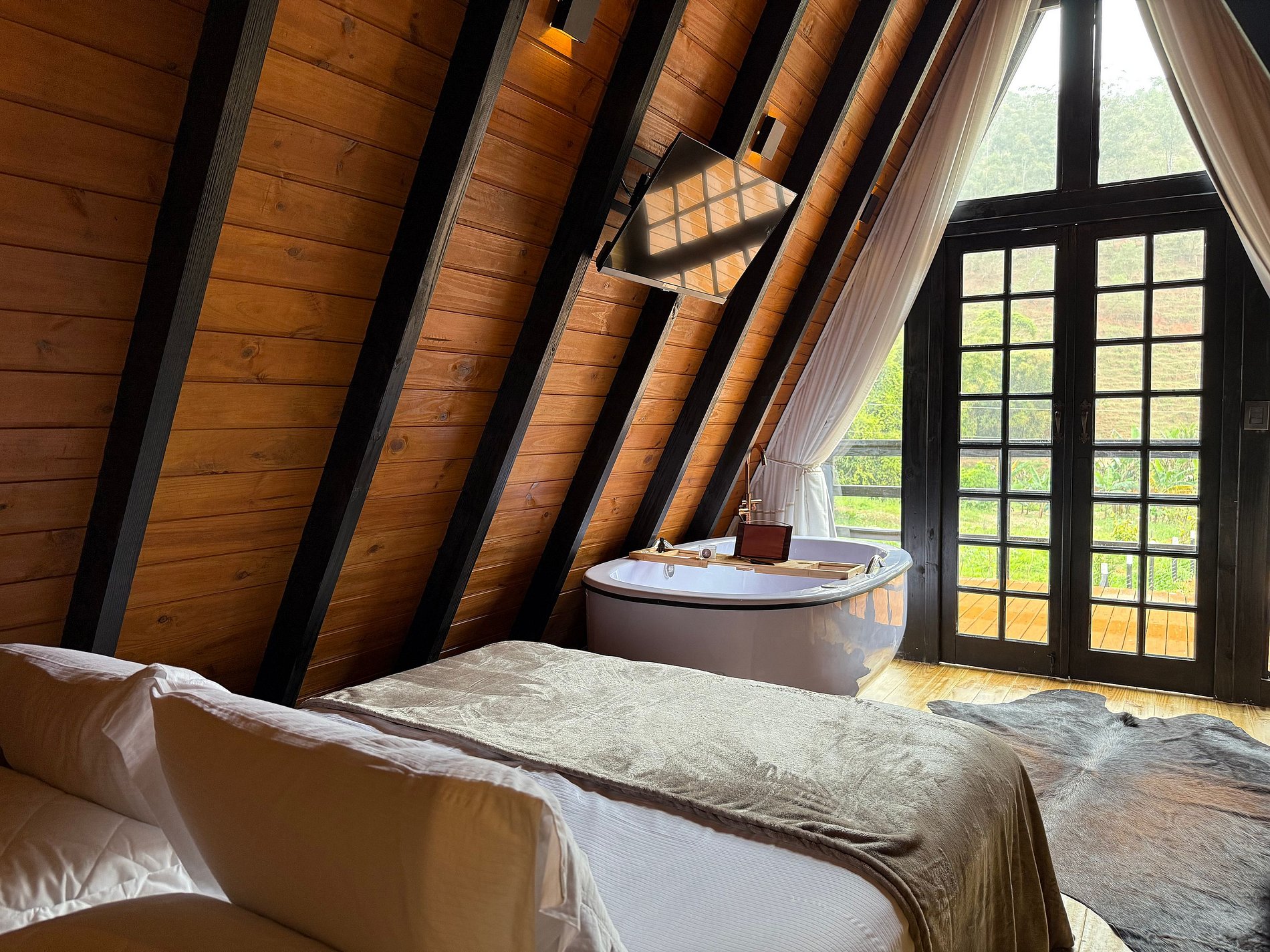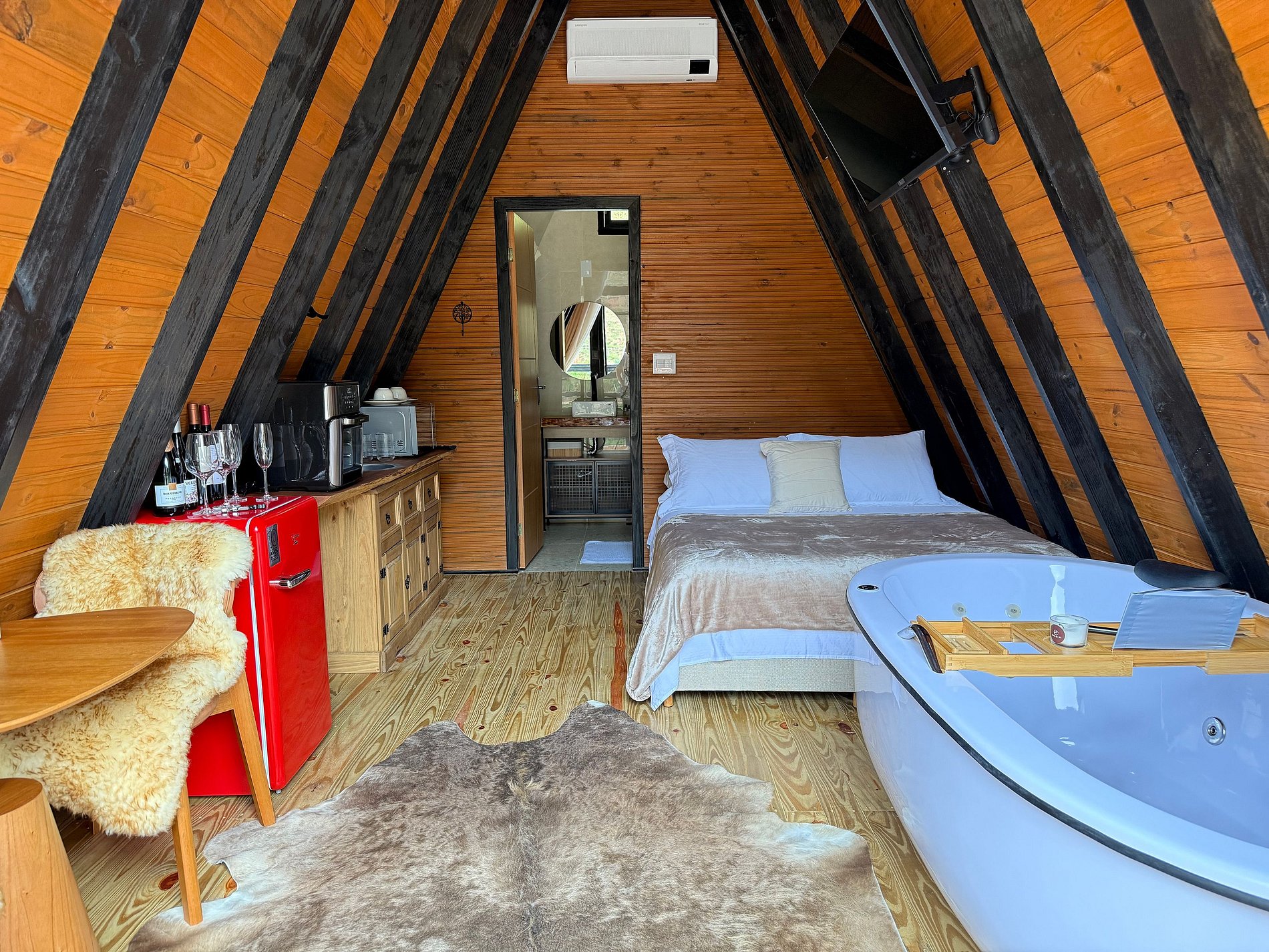 A jacuzzi privativa é o grande destaque, trazendo um toque de conforto e exclusividade. O interior do espaço é aconchegante, com decoração rústica e funcional, pensado para oferecer bem-estar em cada detalhe. Cama confortável, roupas de cama e banho de qualidade e ambientes acolhedores garantem que os hóspedes se sintam em casa.