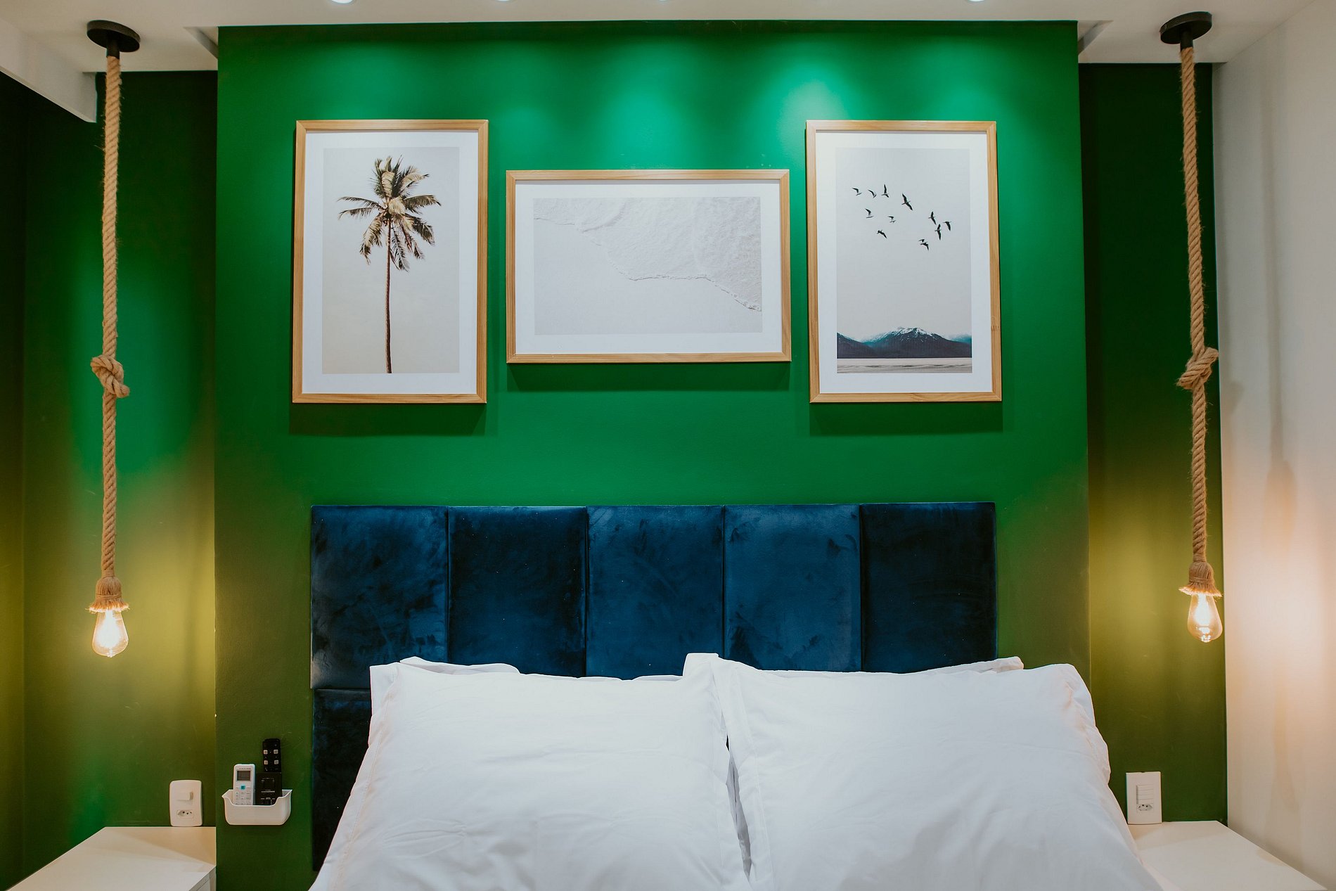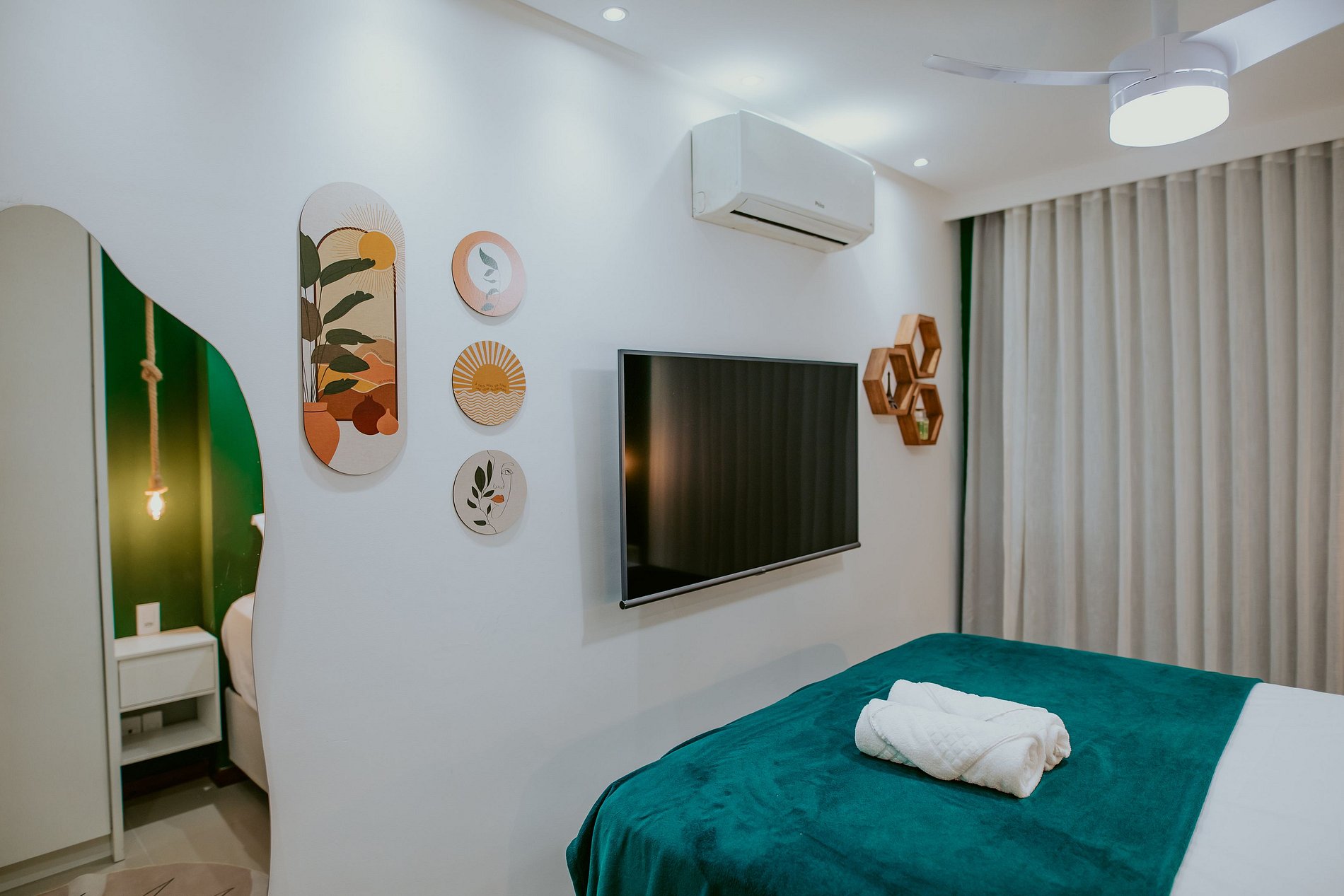 O espaço possui dois quartos bem iluminados e equipados: a suíte principal conta com uma cama queen-size e ar-condicionado, o segundo quarto dispõe de uma cama de casal, ambos com roupas de cama de alta qualidade e armários espaçosos para maior praticidade. A sala de estar é convidativa, equipada com sofá confortável e televisão com streaming.