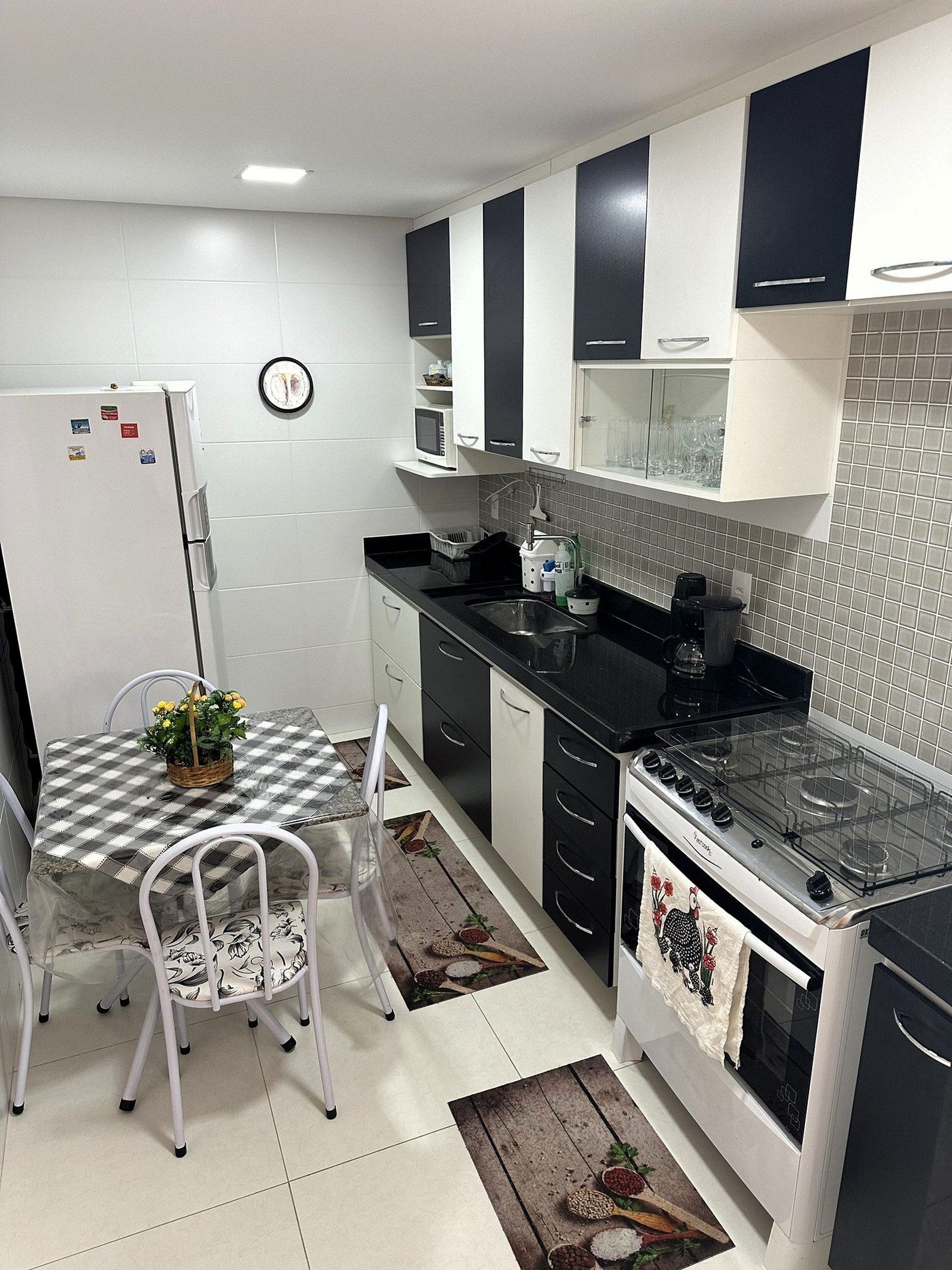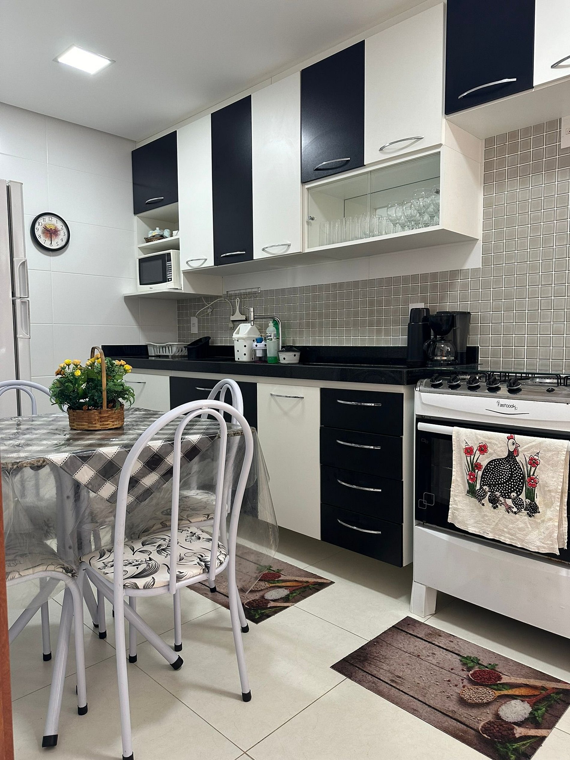 A cozinha possui todos os eletrodomésticos, com muitos utensílios.