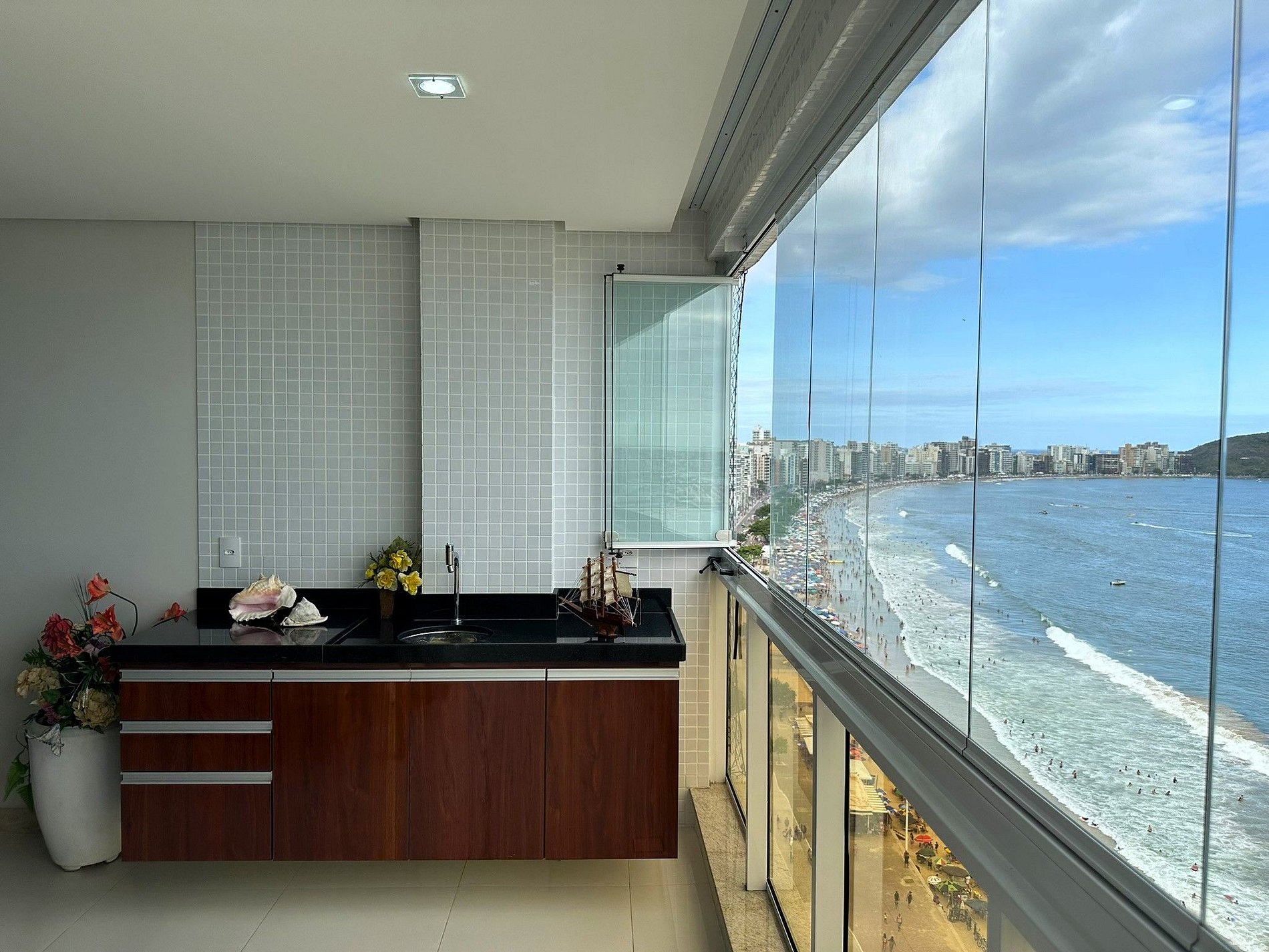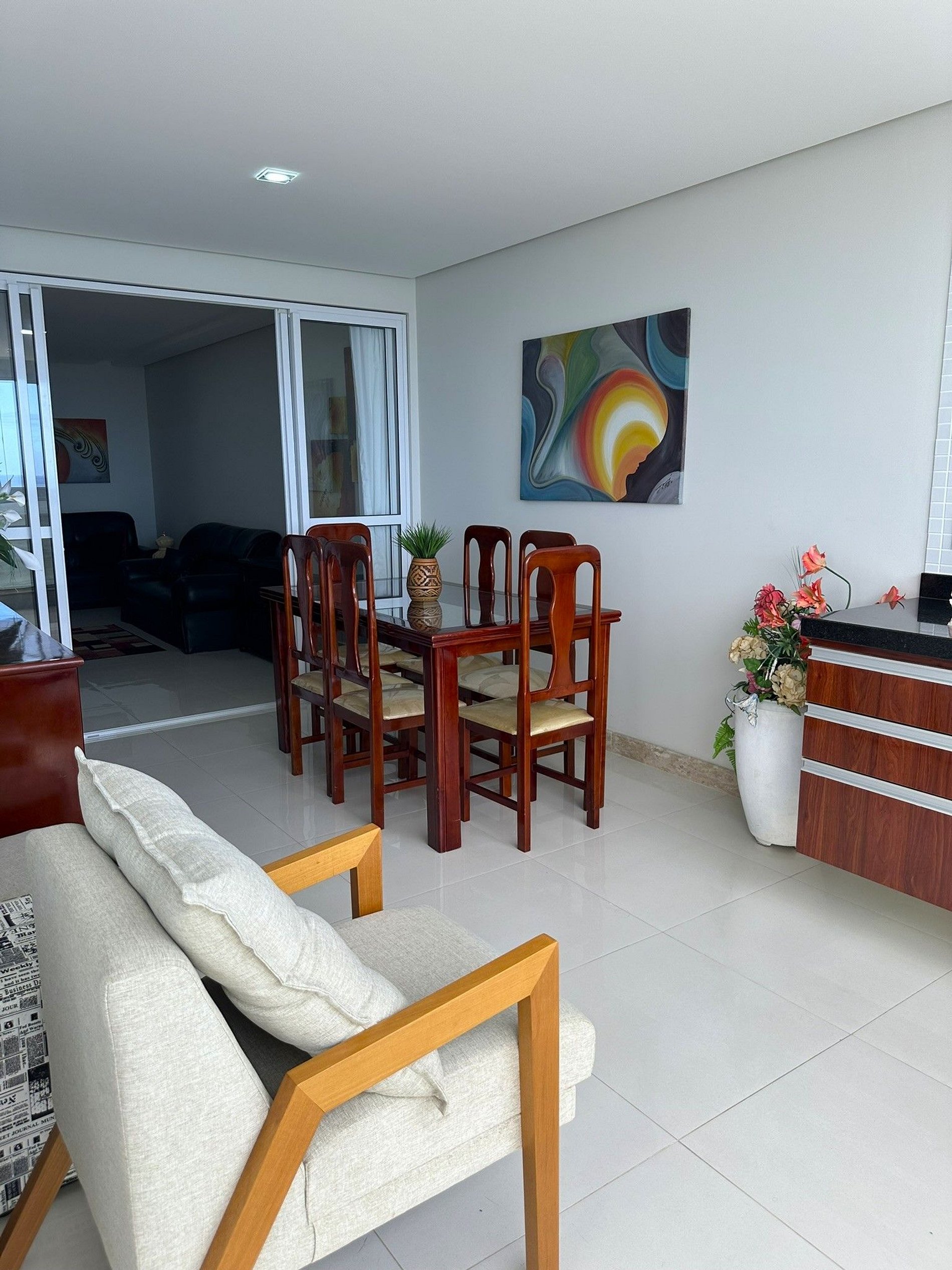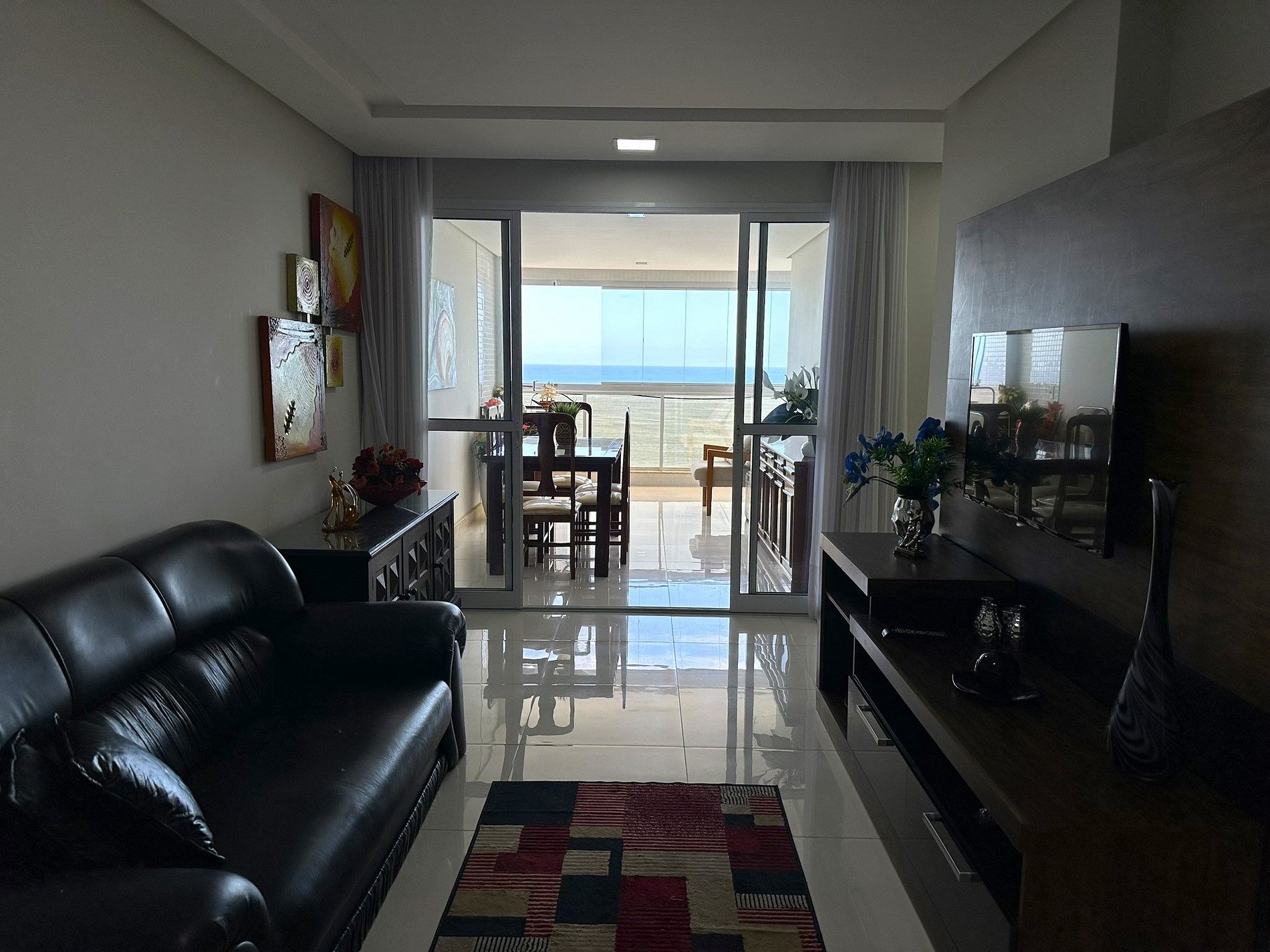 O apartamento conta com sala acolhedora e uma decoração aconchegante, completa com TV e um sofá super confortável para relaxar e se entreter, enquanto desfruta da deslumbrante vista para o mar. A ampla varanda proporciona uma vista infinita para o oceano e calçadão da praia, equipada com mesas e cadeiras, pia e armário, criando um cenário perfeito para momentos únicos de confraternização com familiares e amigos.