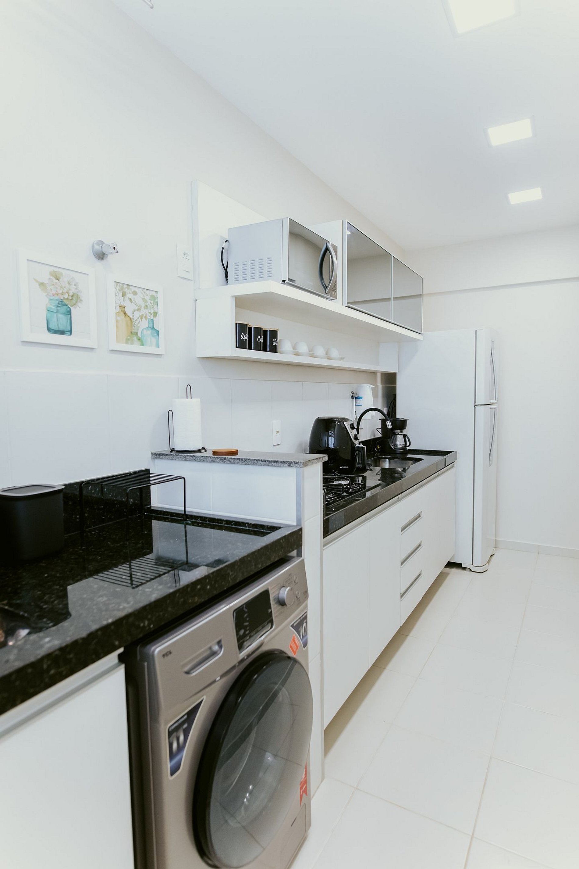 O quarto conta com roupa de cama e banho inclusas, ar-condicionado, TV, armário e ar- condicionado. A sala é super aconchegante, perfeita para relaxar ou trabalhar. A cozinha é completa, equipada com fogão, geladeira, liquidificador, panelas, pratos, talheres, cafeteira, entre outros utensílios. Além disso, há uma máquina de lavar disponível para maior praticidade.