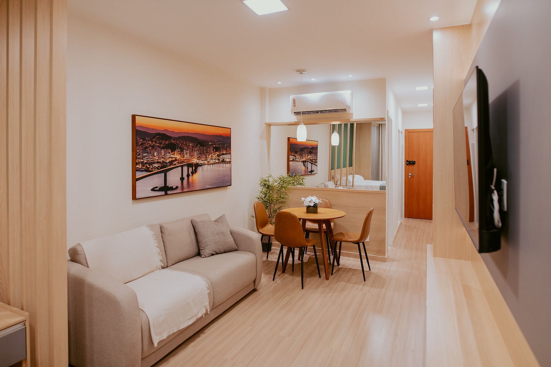 Este estúdio foi cuidadosamente reformado para proporcionar uma experiência moderna, confortável e envolvente. O ambiente é integrado, unindo sala e quarto em um espaço amplo, bem iluminado e totalmente climatizado, criando uma atmosfera leve e acolhedora.