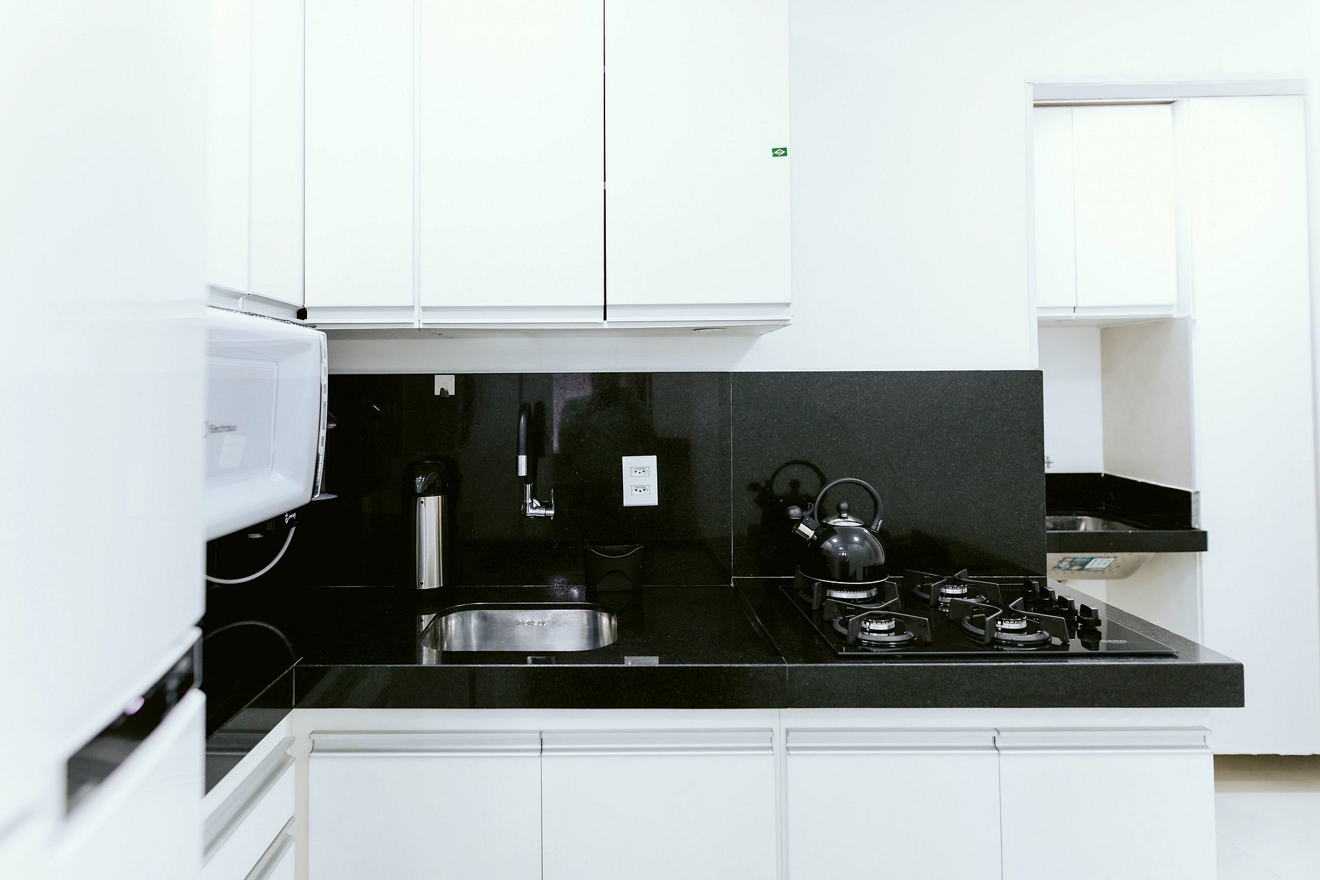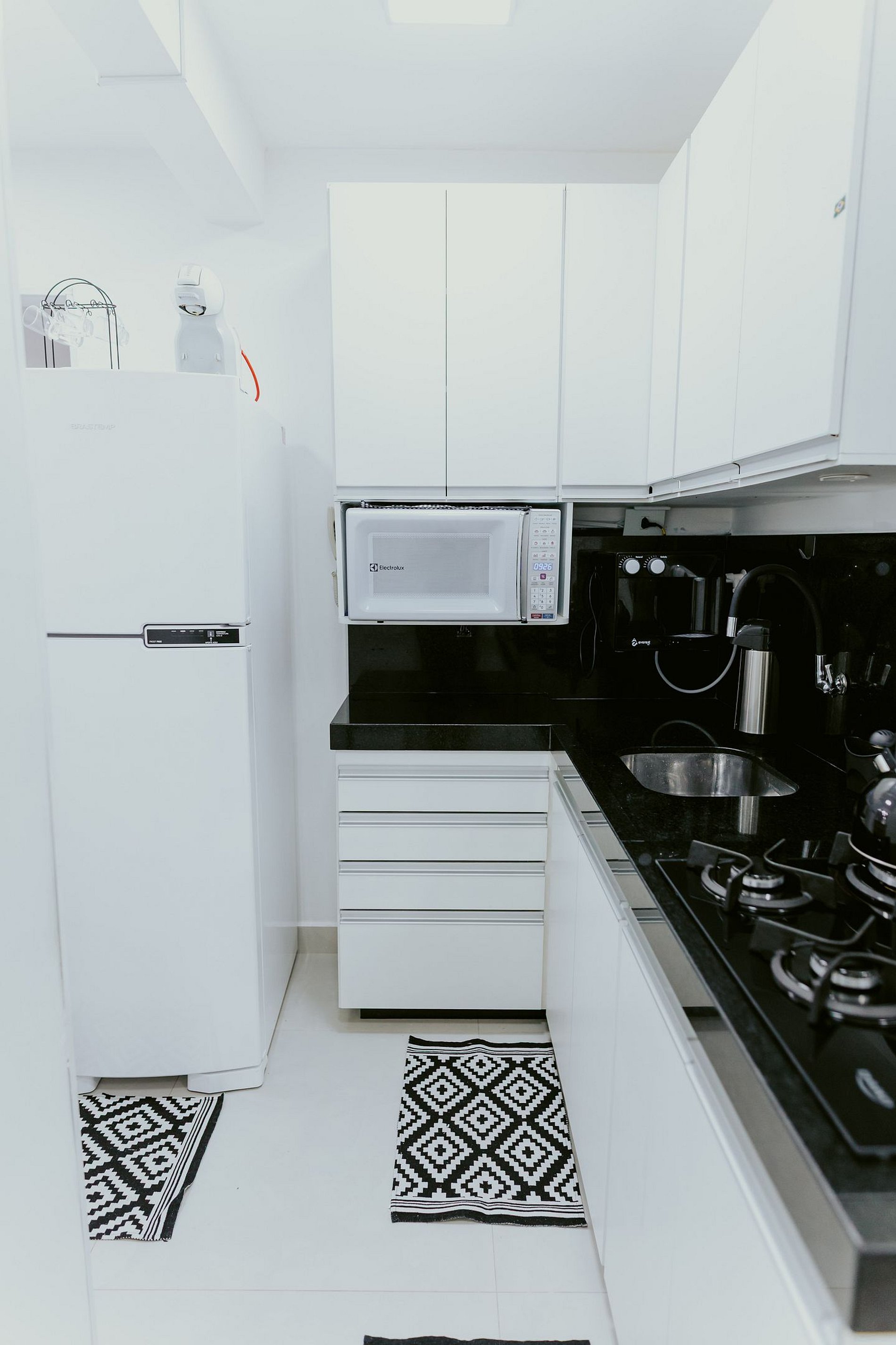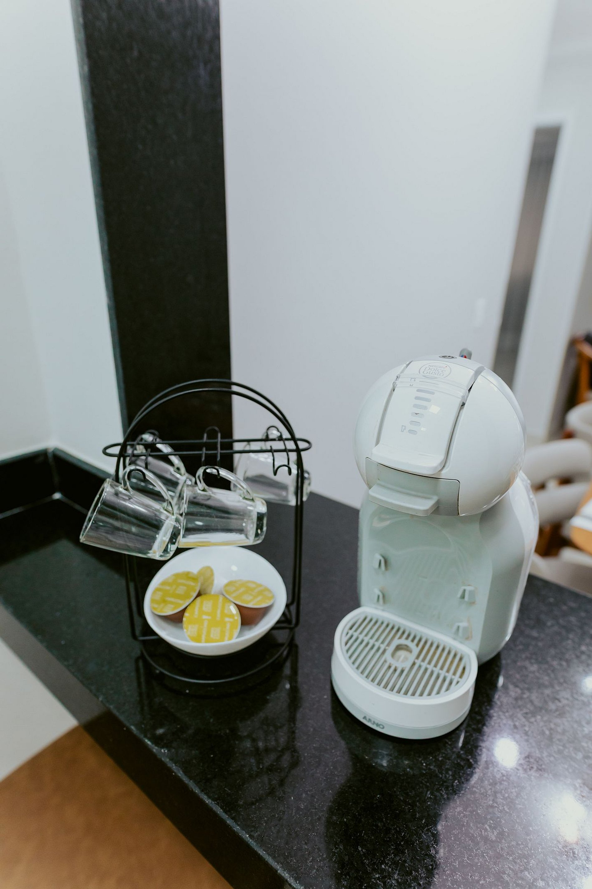 A cozinha é totalmente equipada com geladeira, fogão, forno, micro-ondas, cafeteira, utensílios e louças, ideal para quem prefere preparar refeições durante a estadia. O apartamento também dispõe de Wi-Fi rápido e TV.