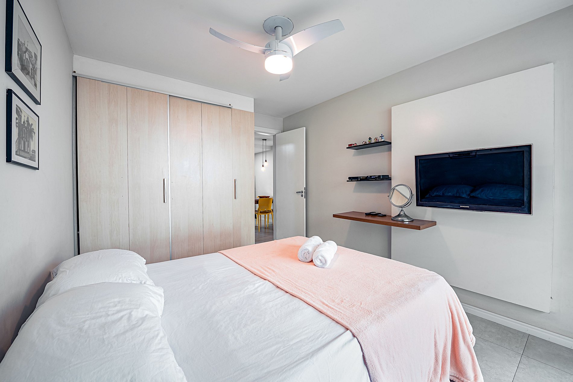O apartamento conta com uma cama de casal no quarto e um sofá-cama na sala, podendo receber até 4 hóspedes.