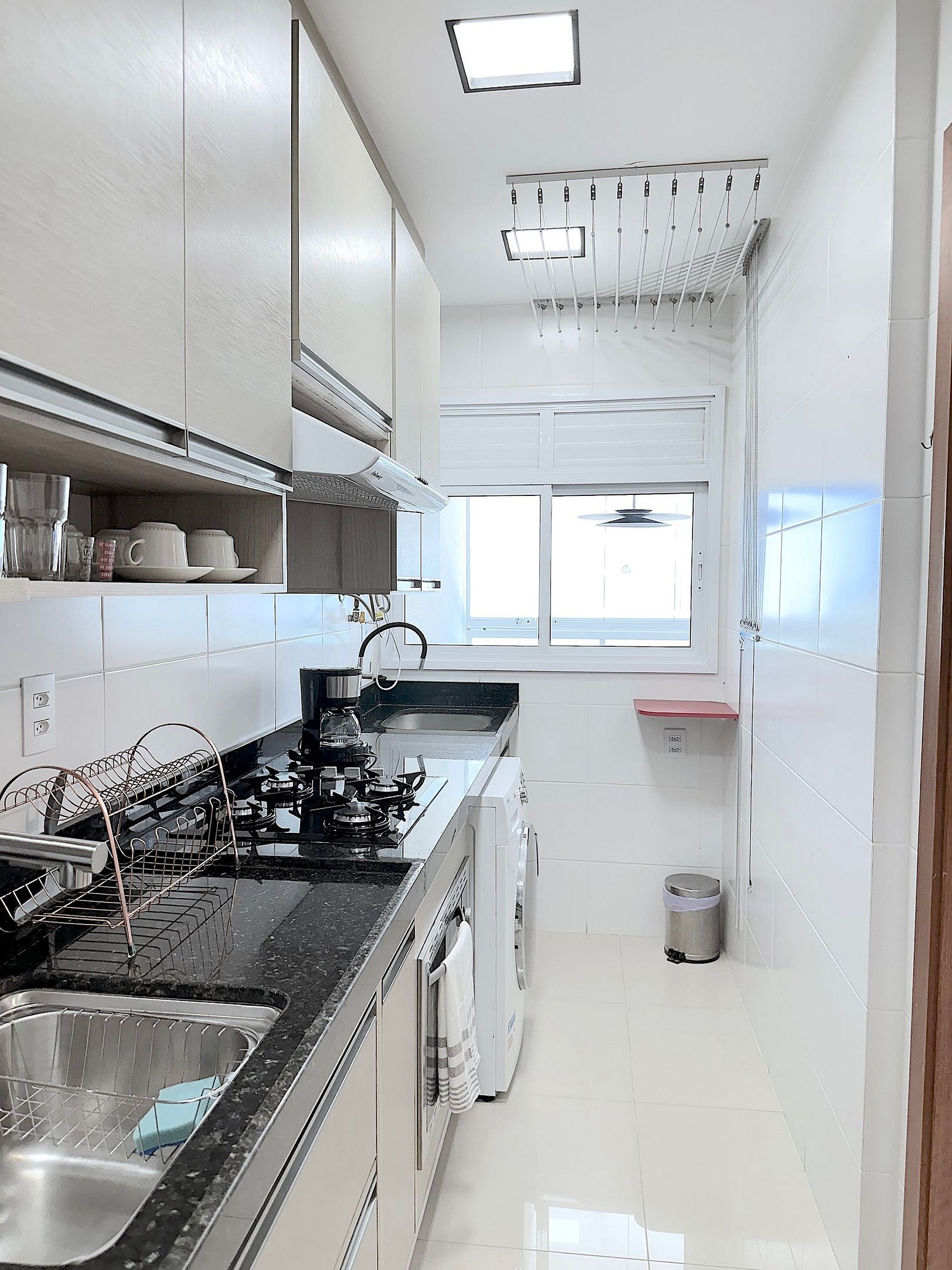 A cozinha é moderna e está completamente equipada com geladeira, fogão, micro-ondas, cafeteira e utensílios para preparar refeições com facilidade. Há também uma mesa de jantar para momentos de descontração. O banheiro é funcional, com chuveiro de alta pressão aquecida a gás e produtos básicos de higiene.