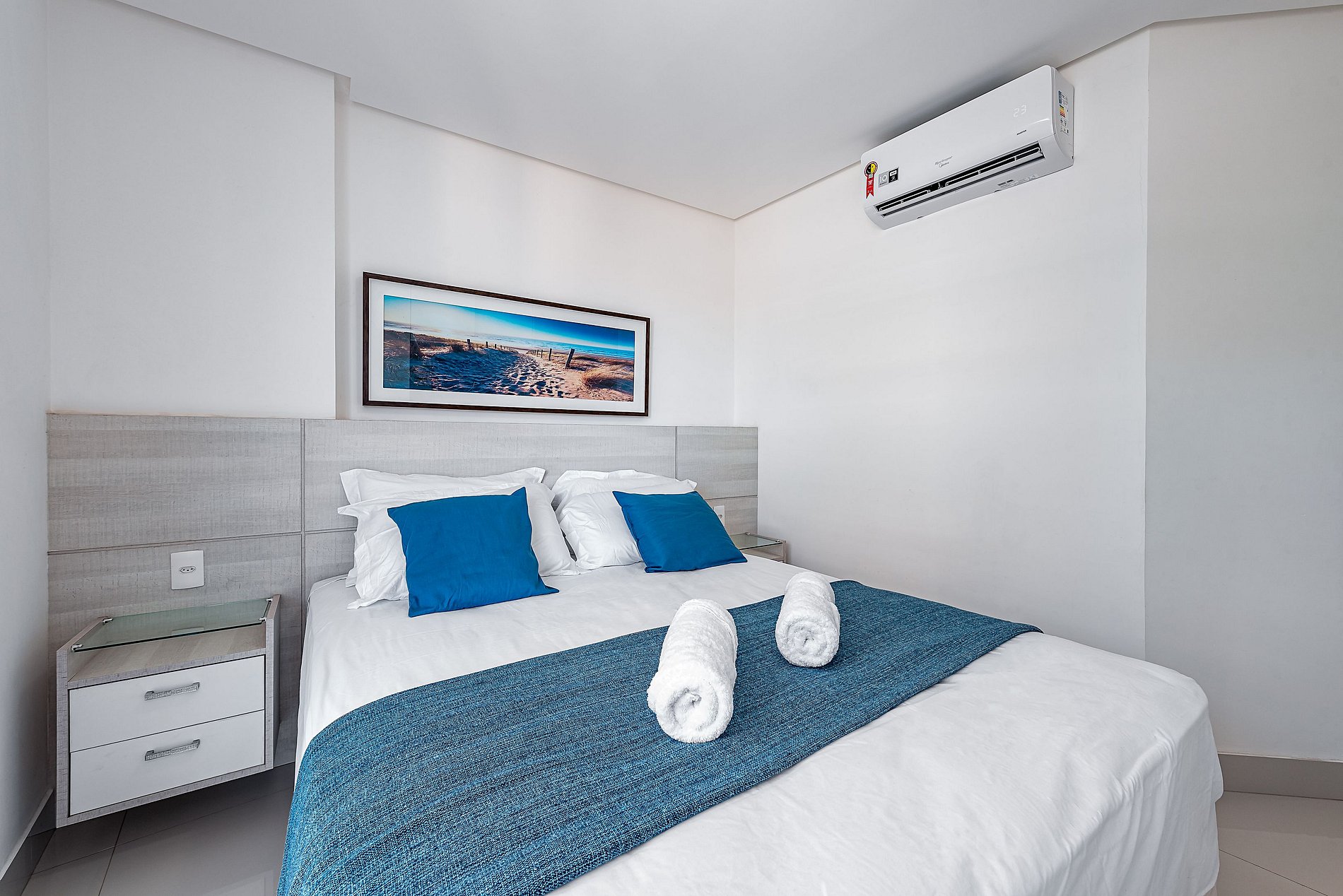 Todos os 3 quartos (1 suíte) possuem TV, ar condicionado, roupa de cama incluso e armários.