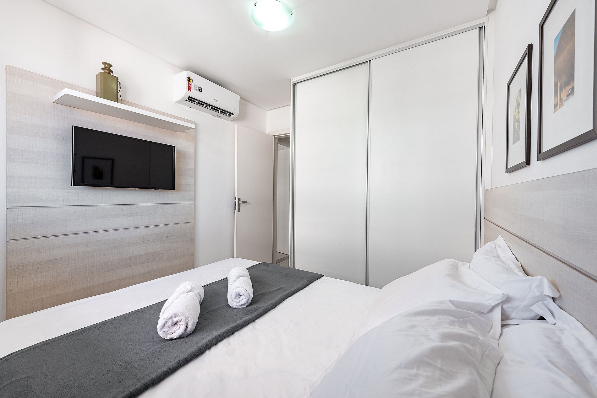 Todos os 3 quartos (1 suíte) possuem TV, ar condicionado, roupa de cama incluso e armários.