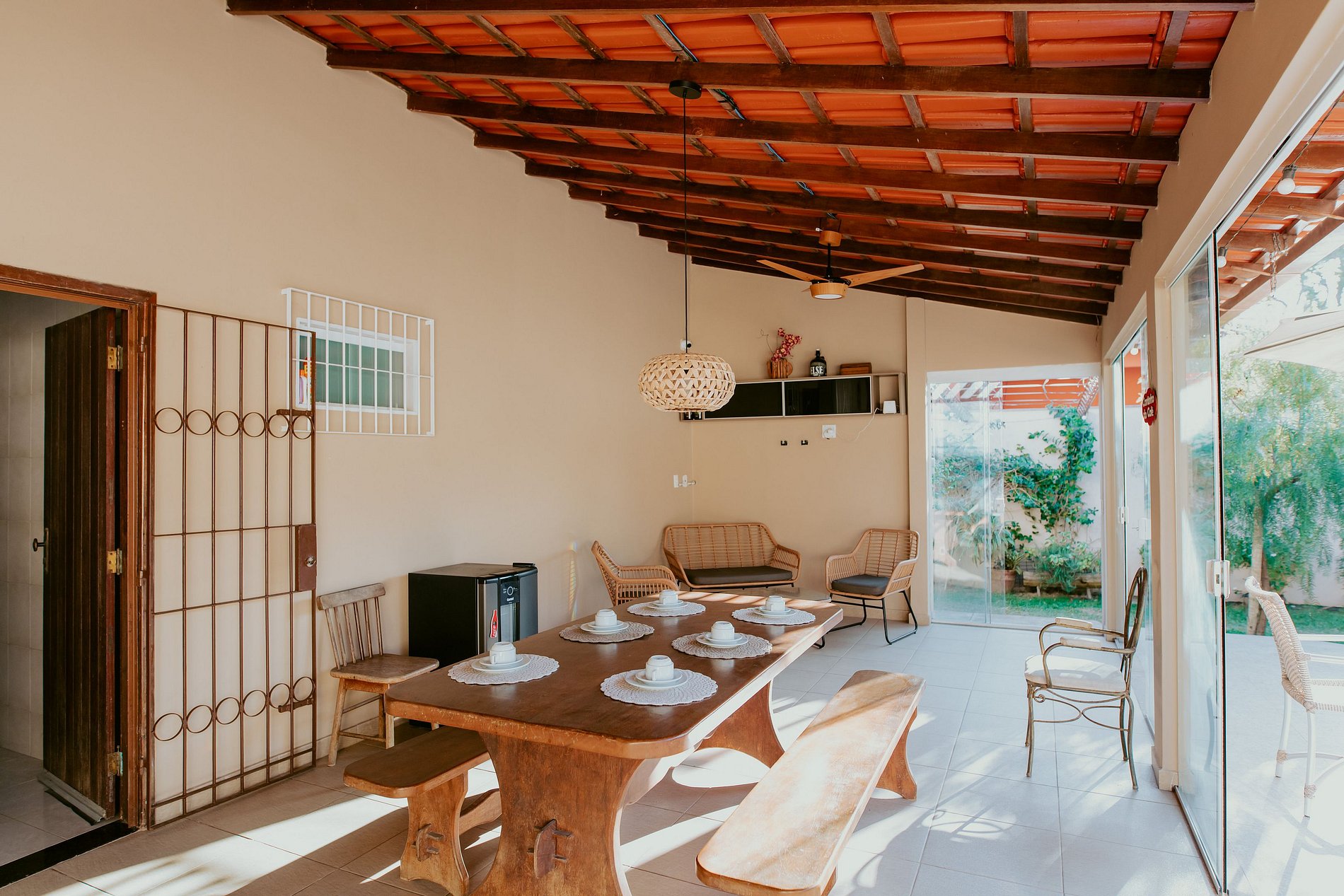 A casa oferece uma estrutura completa para garantir conforto e lazer durante toda a estadia. Conta com piscina com cascata, perfeita para os momentos de descanso, além de uma área gourmet com churrasqueira coberta e utensílios para preparar refeições em grupo. A cozinha é totalmente equipada com geladeira, fogão, micro-ondas, cafeteira, liquidificador, panelas e todos os utensílios necessários. Os ambientes são bem ventilados e climatizados com ar-condicionado nos quartos, garantindo noites agradáveis de sono, além de cortar com roupa de cama e banho. A casa está cercada por uma ampla área verde, que transmite tranquilidade e contato com a natureza, criando um ambiente ideal para descansar. Também conta com Wi-Fi e estacionamento disponível para os hóspedes. É o espaço ideal para quem busca conforto, sossego e uma boa experiência de lazer em meio ao verde.