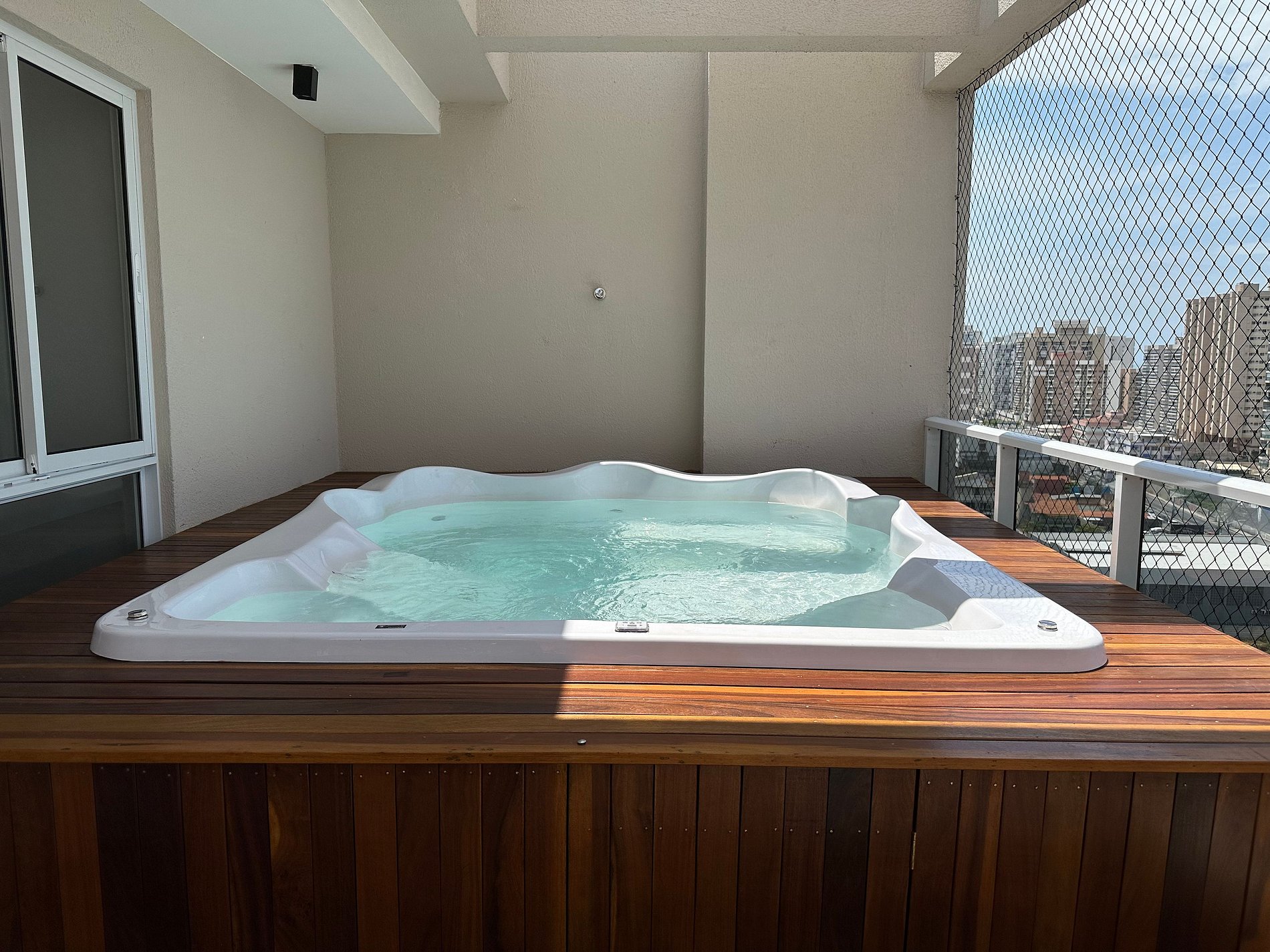 Foi uma hospedagem como era esperado, com muito conforto. O apartamento é muito bom, condiz com o divulgado. Logo ao entrar sentimos o cuidado ao nos receber, ambiente cheiroso, toalhas macias e felpudas, lençóis de ótima qualidade, limpeza primorosa, cozinha equipada com eletrodomésticos essenciais, ressalvando que se forem cozinhar, as panelas podem ser insuficientes. Senti falta de potes para armazenar pequenas quantidades de comida. Para famílias com crianças pequenas não indico, pois as vidraças não tem proteção. Um ponto a ser observado é que o blackout das cortinas não impede a claridade extrema logo ao nascer do sol. A jacuzzi é grande e muito limpa. A área superior poderia ser melhorada, colocando cadeiras de praia para as pessoas que optassem por permanecerem naquele espaço, tomando sol e apreciando um bom churrasco. Os funcionários do condomínio são educados e prestativos.